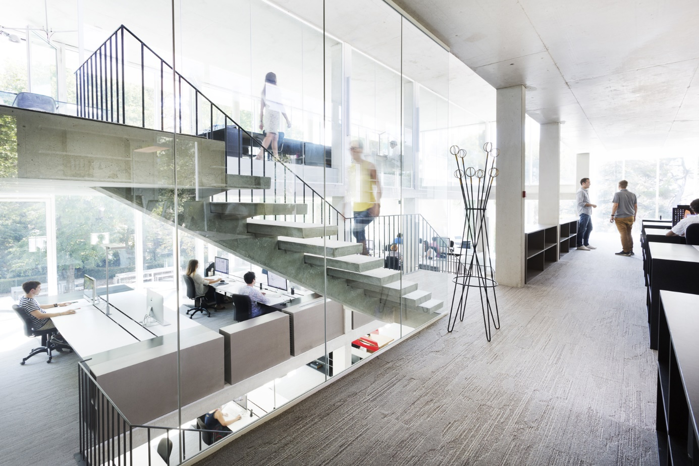 Réalisation dans un parc classé d’une agence d’architecture sur 6 demi-niveaux avec parking en sous-sol et restructuration d’un mas en chambres d’hôtes et restaurant. 1 112 m² pour l’agence + 462 m² pour le Mas soit 1 574 m² au total Les Ateliers A+ ont conçu et réalisé leurs bureaux sur un site exceptionnel niché dans un grand parc classé : le domaine de Lafeuillade. L’architecture intégrée et respectueuse du site révèle la beauté de cet écrin. L’édifice se dresse comme un temple de verre et de béton. Deux immenses moucharabiehs de céramique blanche semblent coulisser pour laisser entrer le visiteur dans un vaste parallélépipède vitré. Le motif stylisé de la résille, composé de milliers de feuilles de céramique fait écho à la vigne vierge qui recouvre le mas historique.