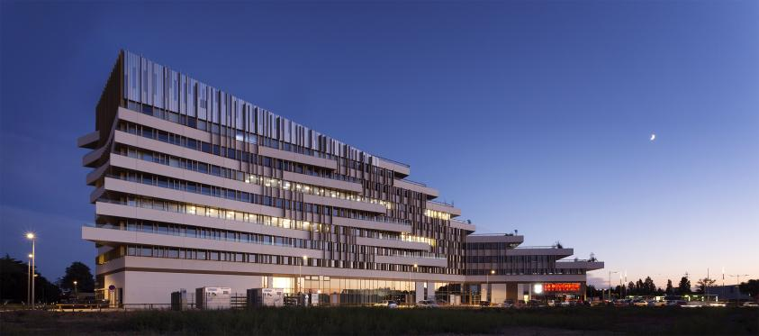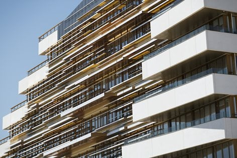 Ensemble de bureaux, commerces et showrooms (R+7), avec parking (R-1). Le Liner affiche une identité architecturale fortement emprunte de son environnement. Le volume est ainsi sculpté comme un rocher, mêlant volontairement l’extérieur aux espaces intérieurs par l’intermédiaire de grandes terrasses paysagères. Il est un archétype du tertiaire de la côte méditerranéenne. Le Liner est implanté à un carrefour d’intermodalité où vélos, tramways, voitures et bus urbains se croisent. Sa silhouette est évolutive et évoque tour à tour les grands immeubles modernes du front de mer, les paquebots flottants, les reliefs de l’arrière-pays, tout en conservant une signature contemporaine. + 1er bâtiment de bureaux RT2012 approchant l’énergie positive + Production de chaud et de froid par sondes géothermiques implantées à 100 m de profondeur sous le bâtiment. Mise en commun des productions sous chaque bâtiment de la ZAC et redistribution. + Gestion séparée et collective des ordures. Les matières recyclables sont traitées spécifiquement à l’échelle de la ZAC et stockées provisoirement à l’intérieur du bâtiment avant d’être amenées à un point de collecte au niveau du parking silo de la ZAC. + Menuiseries avec contacteur à feuillure pour arrêter la climatisation dès qu’une fenêtre est ouverte.
